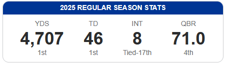 17 Jahre hat er auf diesen Moment warten müssen. Die Wahl war denkbar knapp. Er bekam 24 von 50 Erststimmen, während Drake Maye 23 davon bekam. Am Ende waren es 366 zu 361 Punkte zugunsten Staffords. Er hat es uns und allen anderen bewiesen, dass er es auch im "hohen" Alter noch drauf hat. Mit 4.707 Yards warf er die meisten der Liga und auch seine 46 Touchdowns sind unangefochten. Er hat ganze 12 Touchdowns mehr als sein erster Verfolger Jared Goff, der auf 34 Pässe in die Endzone kommt. Nachdem Stafford zwischendurch diese lange Phase ohne eine einzige Interception hatte, standen am Ende der Saison insgesamt 8 zu Buche.