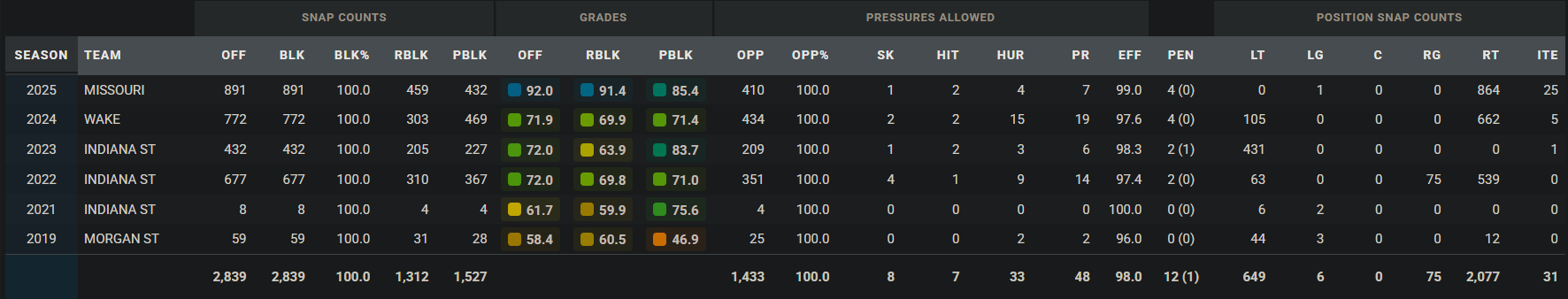 Dieser Wechsel brachte die gewünschte Aufmerksamkeit. Er war ein Anker für das achtbeste Laufspiel der Nation und ließ in der Pass Protection fast nichts zu. Er absolvierte insgesamt 50 Spiele bei vier Colleges und zeigte seine beste Version ganz am Ende.